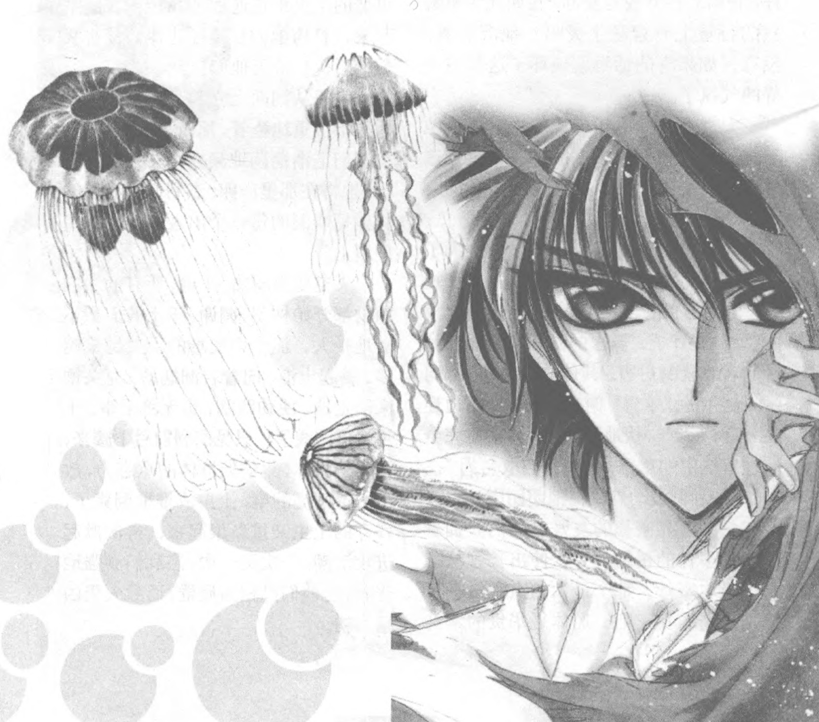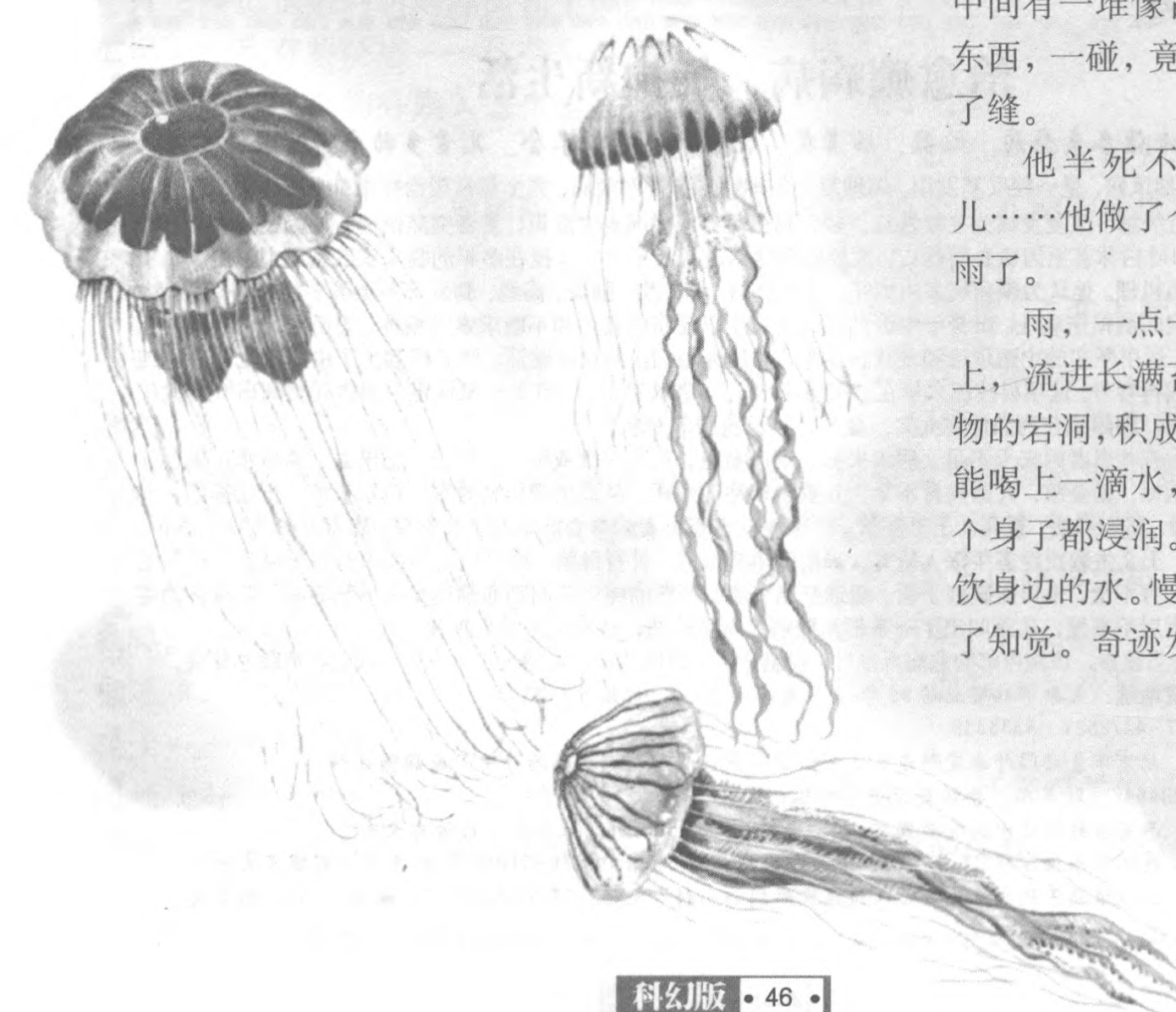 他回转身,发现岩洞里好像挤满了斑驳陆离的活“水母”。他们正是从“炮弹”里生出来的,足有一人高。最后一枚“炮弹”裂开了,露出的圆球胀大成一片片起着波纹的裙边。其他的“水母”都向这只新生的“水母”俯过身去,把裙边连在一起,一起一伏地跳跃着。克莱德完全能理解他们的意思,他给他们取名为“杰利”。杰利们波动着,把他团团围住,好像感觉到了克莱德的友好,他们簇拥着他来到多汁的植物丛旁,伸出长管从花蕊中吸取蜜汁。那个最大的杰利——可能是他们的女王吧,通体是华贵的紫红色,上面点缀着金色的斑点——用她的裙边裹起一朵花,送到克莱德的嘴边。好醇美的浆汁!杰利们个个轮流着把食物送到他嘴边。克莱德逐渐适应了他们的生活,与他们之间的友谊也越发深厚起来了。
