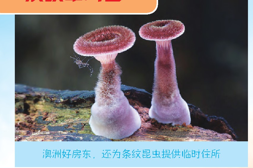 条纹革耳菌,又叫“多毛小号菇”,不仅有亮丽的色彩,还拥有外星景观一样的外形,看上去好像属于另一个星球。这种真菌生活在澳大利亚的森林中,腐烂木头常是它们的栖息地。