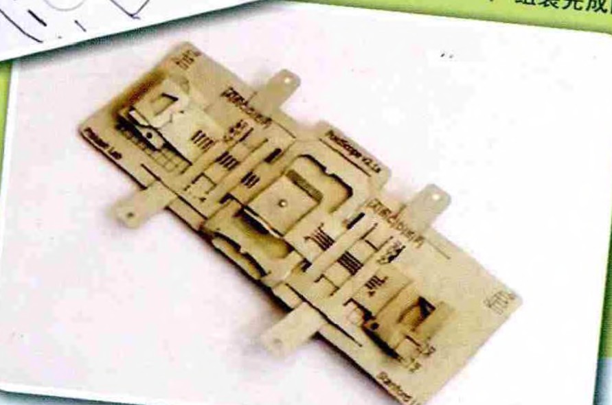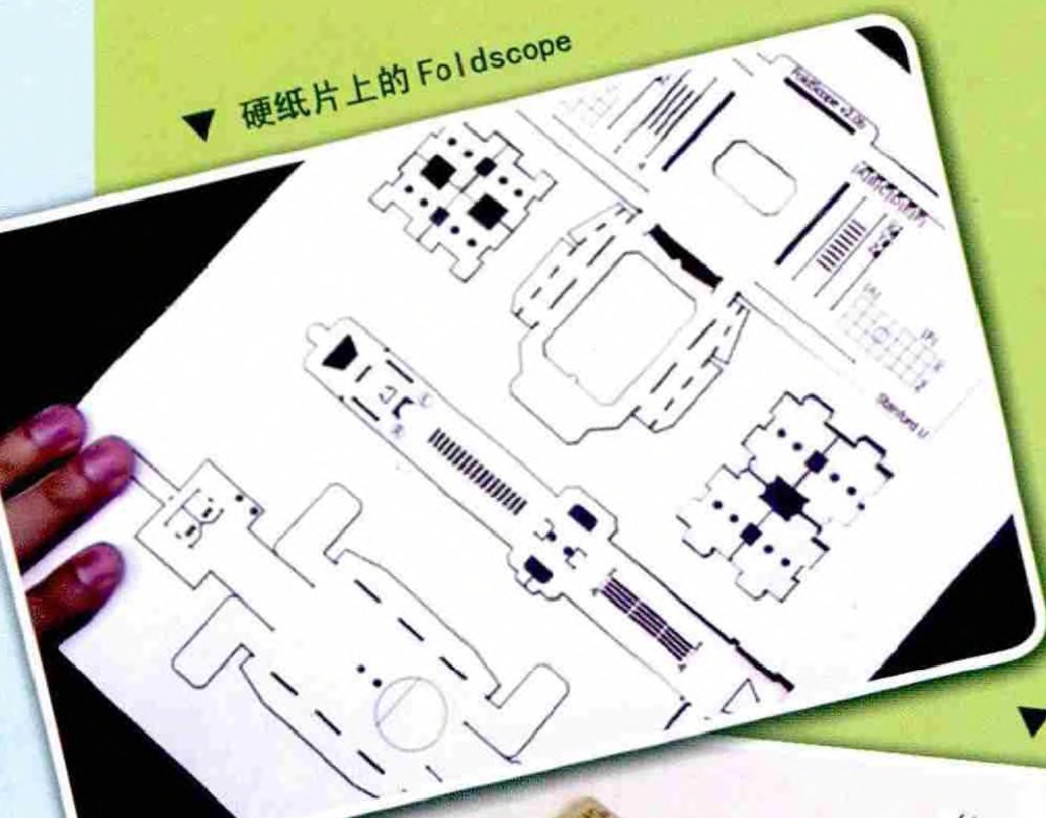 Foldscope的各个部件都印在一张硬纸片上,无需说明书,只要按照\各部件的颜色编码进行剪切和折叠,再借助纽扣式电池供电可持续发光50个小时的LED灯,最后装上微型球面透镜,即可在十分钟内组装出一台精确可靠的手持光学显微镜。组装完成的重量仅相当于两个一元硬币,可以轻松放入口袋,但它的作用并没有打折扣,可以为我们提供接近2000倍的放大效果,并且能够承受意舰踏縣的伤害。