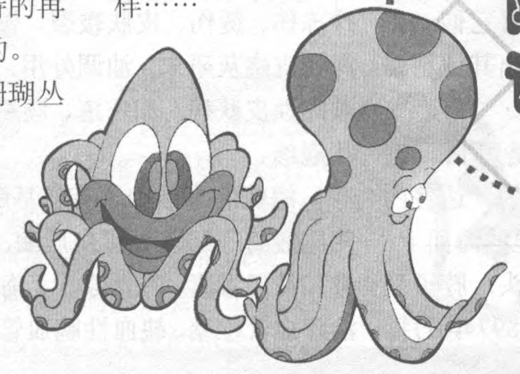 没想到,才离狼口,又入虎穴。我刚游出珊瑚丛准备回家疗伤,一个穿潜水服的人向我猛冲过 来。我吓得魂飞魄散,心里紧张到了极点,胸口 那根半透明的管子顿时变成了黑色,“啪”的一声,放出一个黑色“炸弹”。我身边的海水顿时变成了漆黑一片,这个人一时看不到我了。但黑水在我身旁只滞留了一会儿就渐渐消散了,而我又没有及时找到可以藏身的洞穴。这时,人向我伸过手来,想要抓住我。我连忙把带有粘性的触腕绕住他的手臂,他也顺势抓住了我的触腕。我的吸盘被拉长了,他也被我拖得不住摇晃。情急之中,我爬到他的潜水服上,用触腕搂住他的胸和一只手,在他身上胡乱抽打起来。